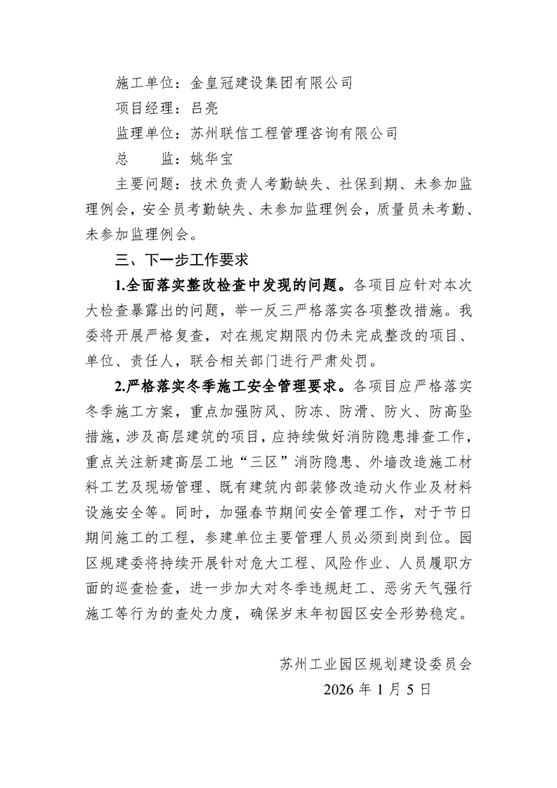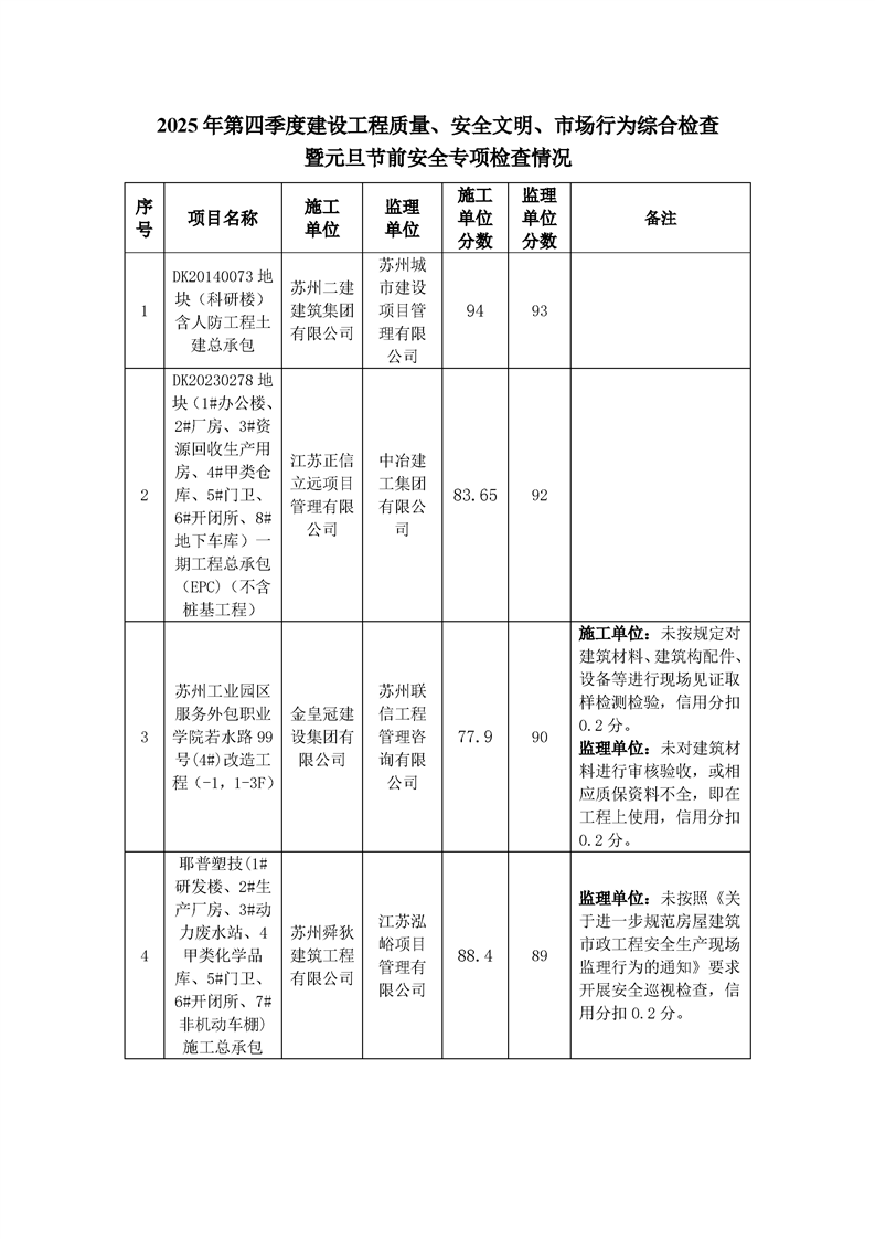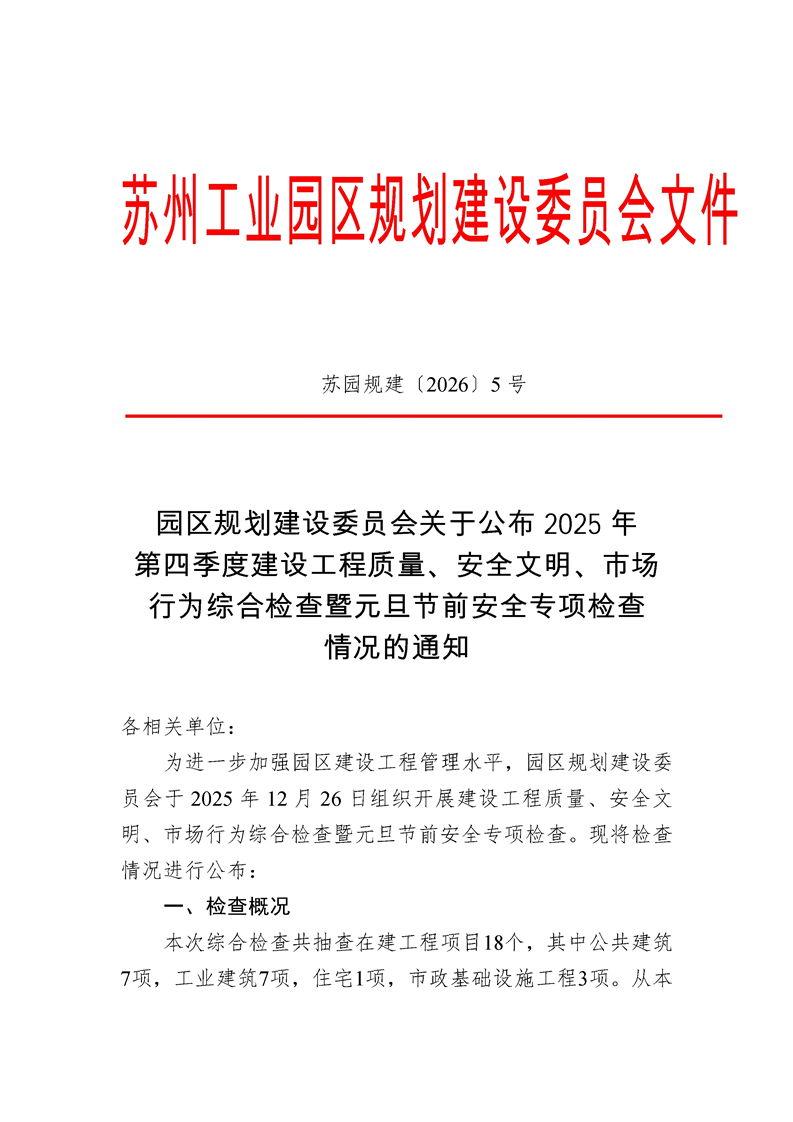 園區規劃建設委員會關于公布2025年第四季度建設工程質量、安全文明、市場行為綜合檢查暨元且節前安全專項檢查情況的通知