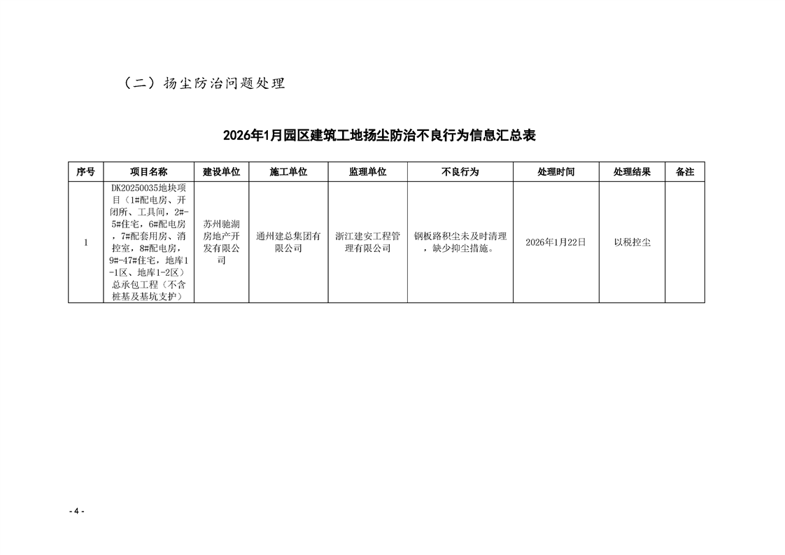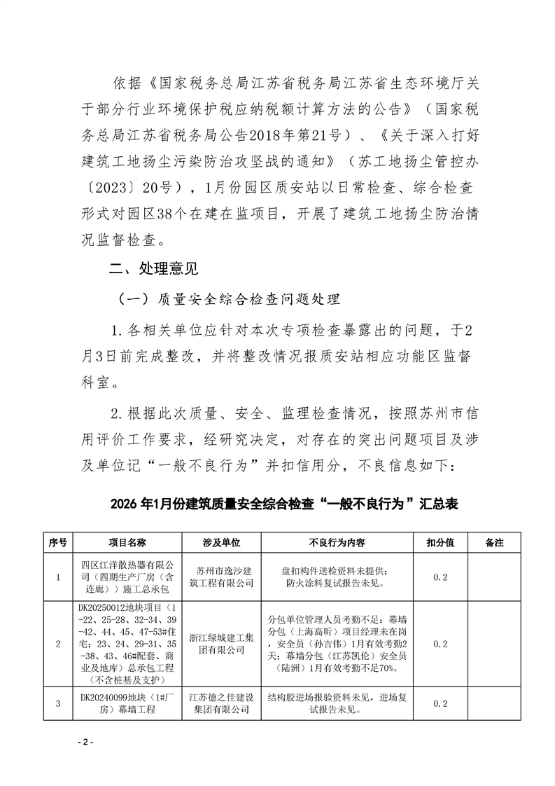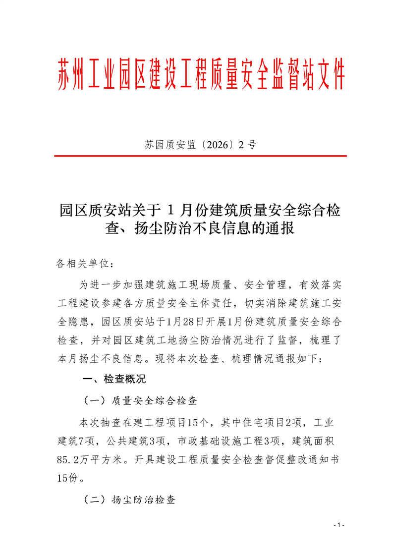 園區(qū)質(zhì)安站關(guān)于1月份建筑質(zhì)量安全綜合檢查、揚塵防治不良信息的通報