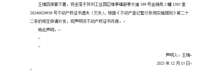 關于蘇州工業園區唯亭鎮葑亭大道599號金錦苑2幢1305室20240029956號不動產權證書遺失聲明