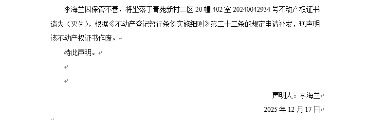 關于青苑新村二區20幢402室20240042934號不動產權證書遺失聲明