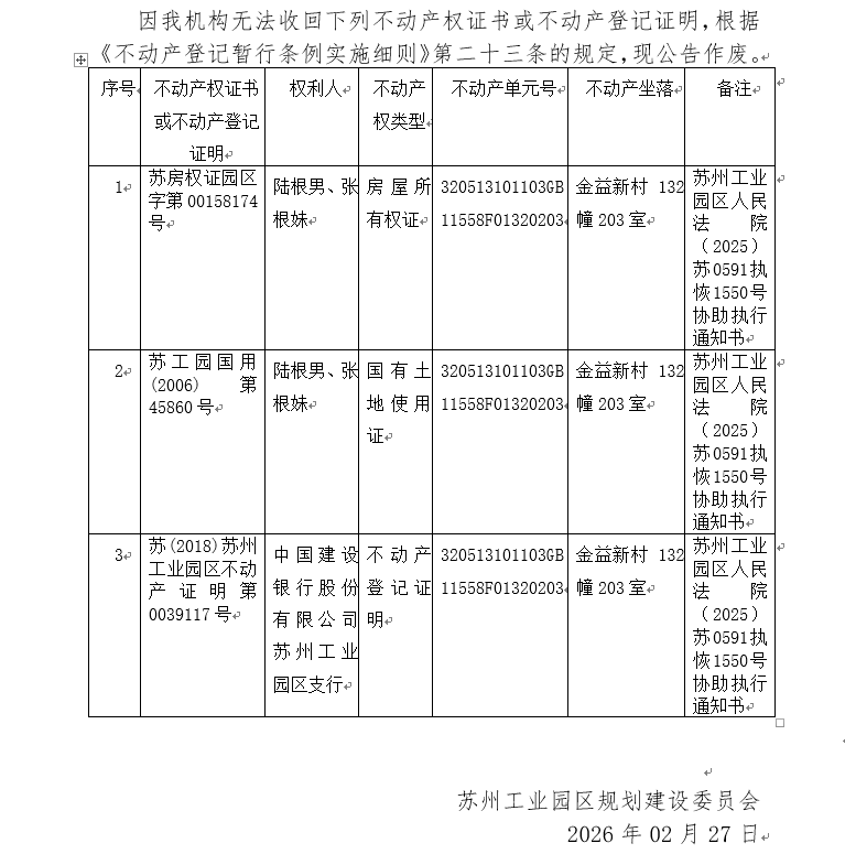 不動產權證書/登記證明作廢公告蘇園 證廢字2026(0048)號(金益新村132幢203室)