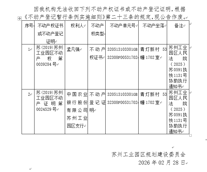 不動(dòng)產(chǎn)權(quán)證書/登記證明作廢公告蘇園 證廢字2026(0053)號(hào)(青燈新村53幢1702室)