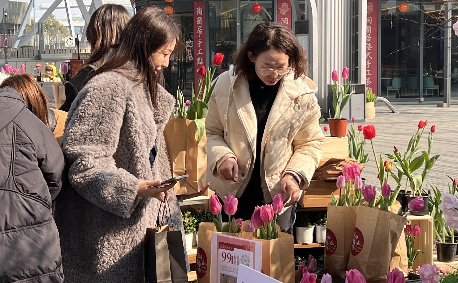 市民李小姐從餐廳出來就直奔花展,她說:“剛剛經過時就注意到‘上新’了年宵花展,紫的神秘,紅的熱烈,黃的燦爛,不僅為街區增添了活力,也讓春節的氛圍更濃郁了!現場還能用積分兌換限定郁金香,既幸運又特別喜慶!”