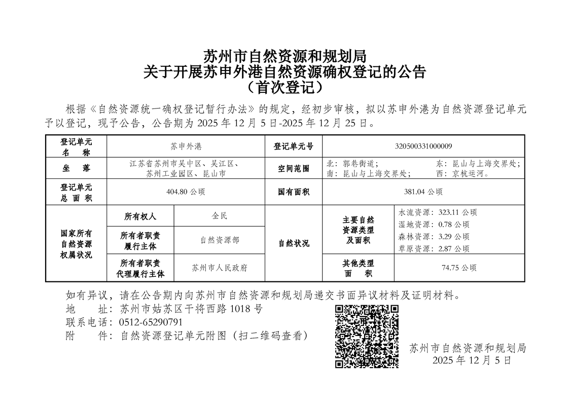 蘇州市自然資源和規劃局關于開展蘇申外港自然資源確權登記的公告(首次登記)