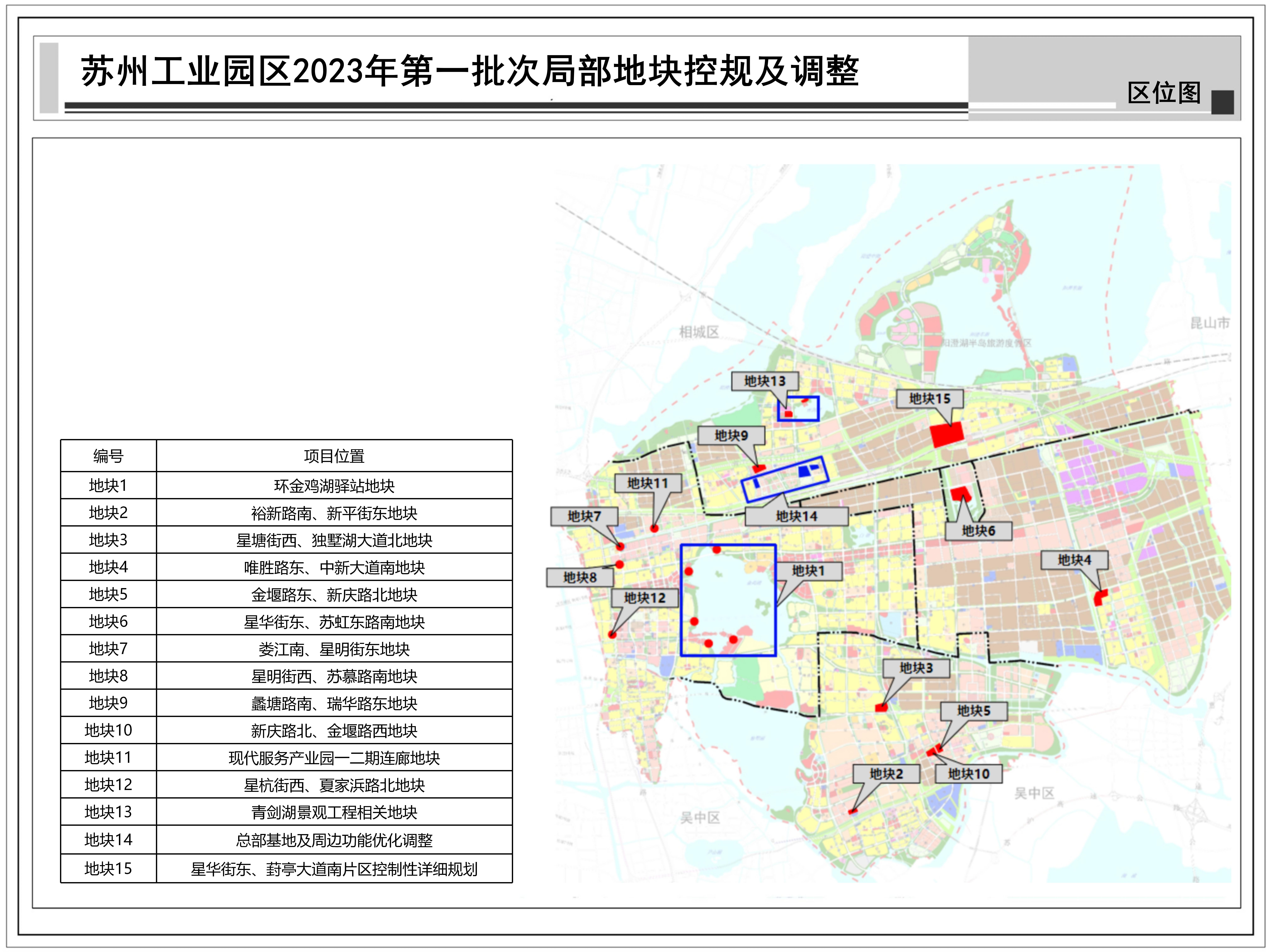 蘇州工業園區2023年第一批次局部地塊控規及調整:共包括15個地塊,總用地面積約1.38平方公里,詳見附圖區位圖。