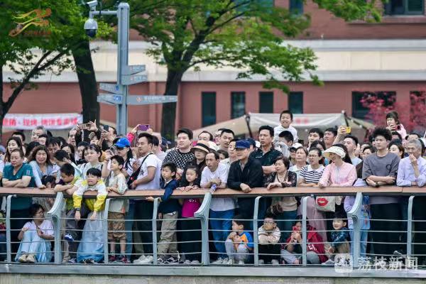 金雞湖上,一艘艘龍舟上演百龍爭渡,龍舟隊員們齊心協力、揮槳如飛,向著終點全力沖刺。現場,既有專業隊伍的速度與激情,也有國際友人解鎖“龍舟新姿勢”,彰顯著“龍舟精神”的多元魅力。如今,金雞湖端午龍舟賽已經成為蘇州的新民俗,吸引了眾多的市民和游客前來觀賽,為自己喜愛的隊伍加油助威。