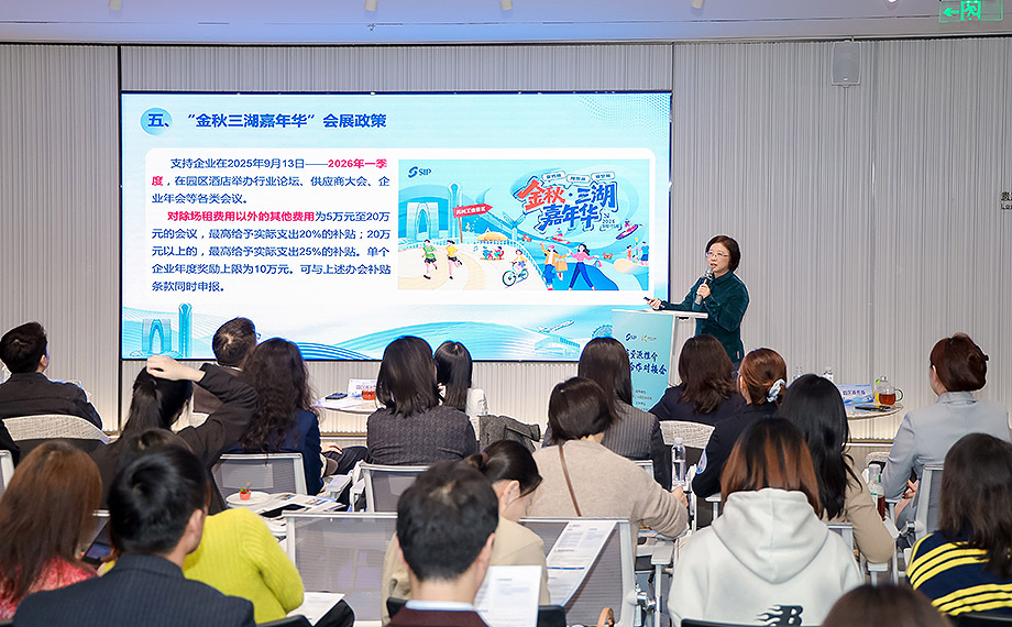 會上,園區(qū)商務局服貿處詳細介紹了園區(qū)辦會辦展專項政策,以及各類規(guī)模會議補貼內容。作為“金秋?三湖嘉年華”系列讓利舉措之一,園區(qū)首次出臺企業(yè)在酒店辦展辦會的補貼政策,以真金白銀惠企利民。自2025年9月13日起至2026年一季度,企業(yè)在園區(qū)酒店舉辦各類會議會展活動,除場租費用外的其他費用可享受20-25%補貼,最高10萬。