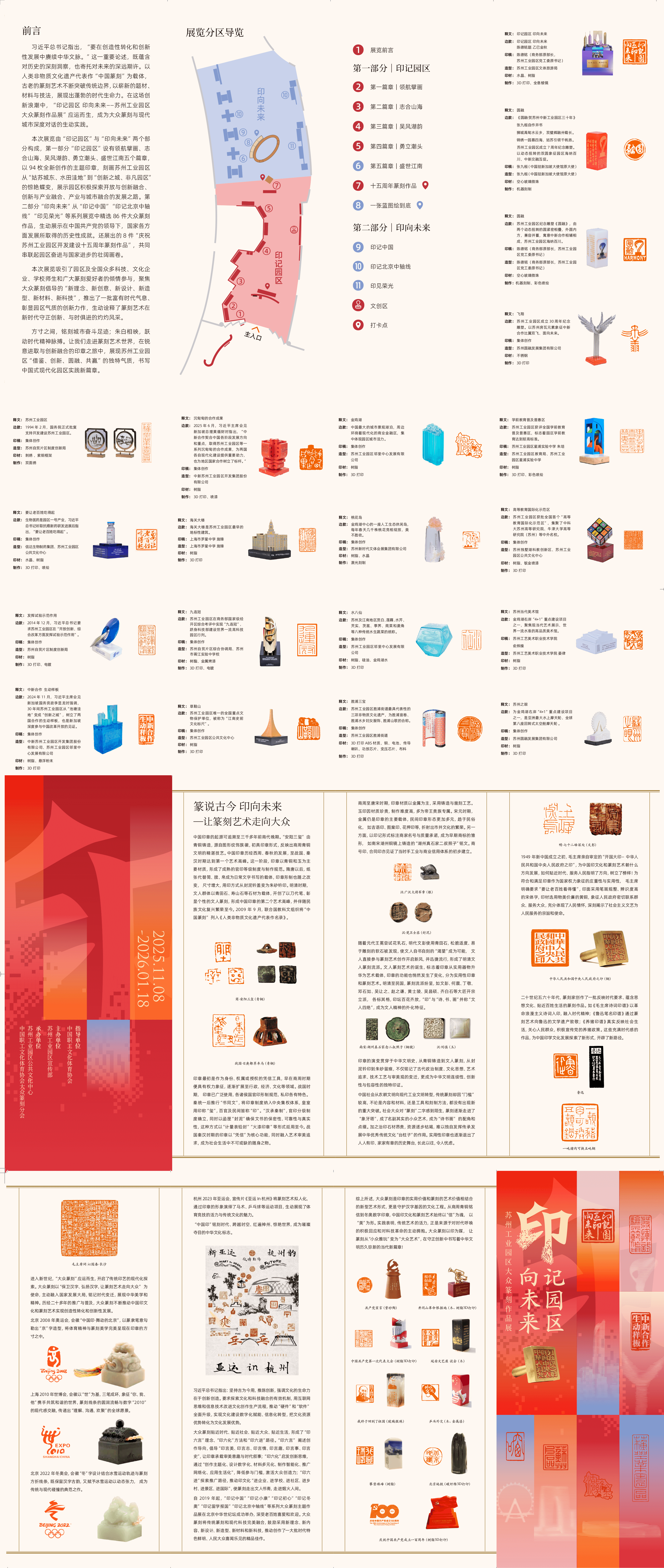 當(dāng)傳統(tǒng)篆刻技藝與現(xiàn)代科技相遇,當(dāng)印石藝術(shù)記錄城市發(fā)展年輪,一場(chǎng)跨越時(shí)空的藝術(shù)對(duì)話(huà)正在上演。2025年11月8日至2026年1月18日,“印記園區(qū) 印向未來(lái)”蘇州工業(yè)園區(qū)大眾篆刻作品展正式在園區(qū)文化館拉開(kāi)帷幕,展覽精選180枚篆刻佳作,以方寸之間的藝術(shù)語(yǔ)言,生動(dòng)展現(xiàn)園區(qū)發(fā)展歷程、創(chuàng)新精神與文化底蘊(yùn),為“金秋·三湖嘉年華”增添獨(dú)特的藝術(shù)魅力。展品精良,深植園區(qū)文化基因展覽以“印記園區(qū)”“印向未來(lái)”兩大板塊構(gòu)建完整敘事脈絡(luò),不僅彰顯了專(zhuān)業(yè)的藝術(shù)水準(zhǔn),更深度融合園區(qū)特質(zhì),讓篆刻藝術(shù)與園區(qū)發(fā)展、城市記憶深度交融。在“印記園區(qū)”部分,94枚全新創(chuàng)作的印章形成“領(lǐng)航擘畫(huà)”“志合山海”“吳風(fēng)湖韻”“勇立潮頭”“盛世江南”五大篇章,立體勾勒了園區(qū)的驚艷蝶變。其中,《發(fā)揮試驗(yàn)示范作用》印章以DNA雙螺旋結(jié)構(gòu)象征生物醫(yī)藥、芯片造型... [詳細(xì)]