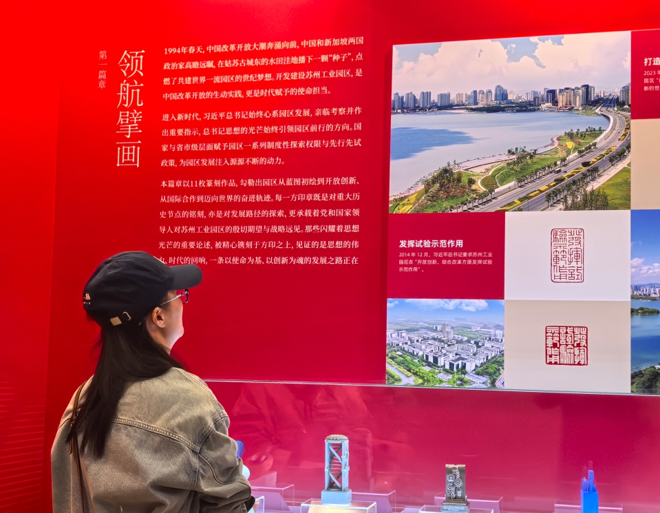 本次展覽以篆刻藝術(shù)為獨特載體,生動展現(xiàn)蘇州工業(yè)園區(qū)從“姑蘇城東、水田洼地”到“創(chuàng)新之城、非凡園區(qū)”的驚艷蝶變,展示園區(qū)積極探索開放與創(chuàng)新融合、創(chuàng)新與產(chǎn)業(yè)融合、產(chǎn)業(yè)與城市融合的發(fā)展之路。為廣大市民與文化愛好者呈現(xiàn)了一場沉浸式藝術(shù)盛宴。