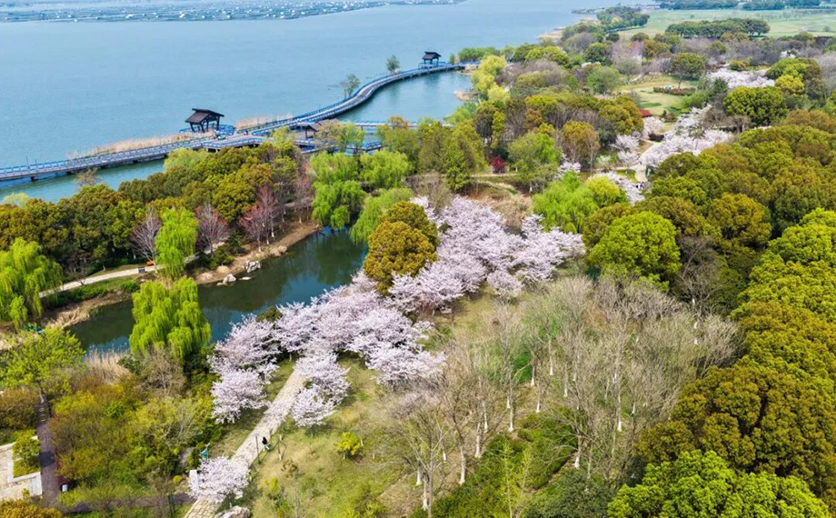 陽澄湖半島環(huán)湖自行車道上,騎行隊伍絡(luò)繹不絕,櫻花沿路盛放,游客迎風(fēng)馳騁,將春日美景盡收眼底。