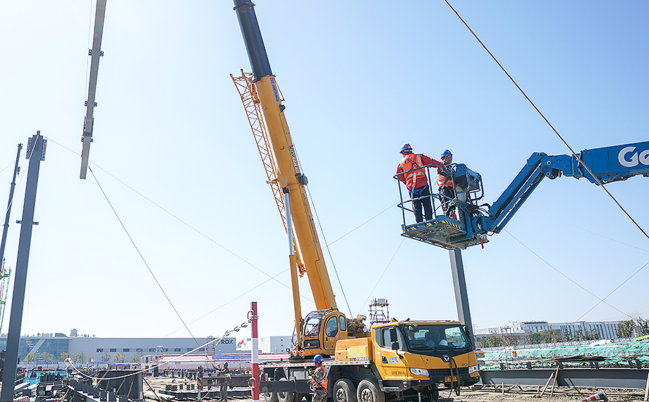 “目前項目進展順利,我們正集中力量進行聯(lián)合廠房主結(jié)構(gòu)吊裝工作。”項目現(xiàn)場執(zhí)行經(jīng)理代楚光介紹道。未來,這片約158畝的土地上,將崛起總建筑面積7萬多平方米的智能化工廠。為高效推進建設(shè),項目被劃分為四個分區(qū)同步施工。“一區(qū)當前配備了四臺吊車進行鋼結(jié)構(gòu)組裝,預(yù)計兩周內(nèi),該區(qū)域主結(jié)構(gòu)將全面搭建完成。”