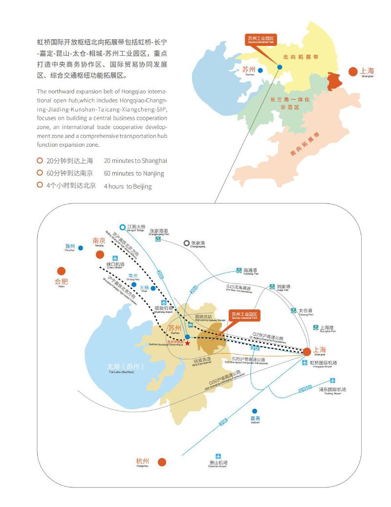 蘇州工業(yè)園區(qū)是蘇州面向未來(lái)的城市新中心,以發(fā)達(dá)的高速公路、鐵路、水路及航空網(wǎng)與世界各主要城市相連;軌道交通20分鐘到達(dá)上海、60分鐘到達(dá)南京、4個(gè)小時(shí)到達(dá)北京,是長(zhǎng)三角地區(qū)重要的總部經(jīng)濟(jì)和商務(wù)文化活動(dòng)中心,是虹橋國(guó)際開(kāi)放樞紐北向拓展帶的重要一環(huán)。
