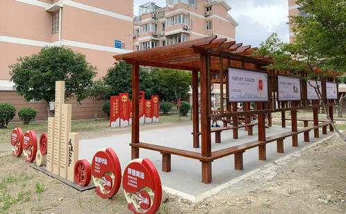 為填補社區(qū)法治文化陣地空白,讓居民在家門口便捷學法,淞漁社區(qū)打造的法治文化新空間“法治文化長廊”完成建設(shè)并正式投入使用。長廊內(nèi)懸掛“維護法律權(quán)威,共建法治社區(qū)”“學法人人受益,守法人人和諧”等鮮明標語,打造抬頭可見的法治文化環(huán)境,并特別增設(shè)法治主題微景觀區(qū),巧妙融入“法”字、窗花、法律名稱等元素,形成兼具教育性與觀賞性的小型景觀帶,讓法治長廊成為提升社區(qū)法治氛圍的重要陣地。為回應居民休憩議事需求、挖掘集體記憶潛力,淞源社區(qū)積極探索援法議事新實踐,依托承載居民情感的百年香樟,打造了集休憩、議事、普法功能于一體的“香樟樹下議事園”。在保留原有自然風貌基礎(chǔ)上,園內(nèi)增設(shè)桌椅、遮陽棚、信箱等便民設(shè)施,將自發(fā)聚集點升級為功能完善的公共空間。同時,社區(qū)創(chuàng)新設(shè)置援法議事機制,使該園成為社區(qū)協(xié)商、依法解決身邊事的實踐平臺,讓這處充滿溫度的議事空間成為法治精神融入基層治理的新載體。
