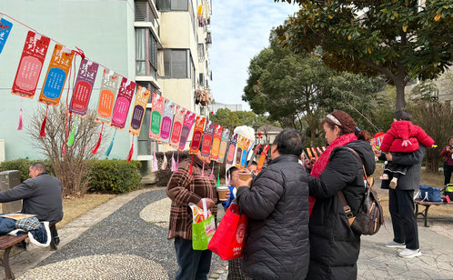 燈謎競猜區人頭攢動,猜中謎底的居民喜滋滋地領取獎品;花燈手作區里,居民們在“紅管”志愿者指導下提筆描繪、折疊粘貼,一盞盞創意花燈點亮笑容;一旁的趣味套圈區同樣熱鬧,孩子們有序排隊,瞄準目標、輕輕一擲,動作行云流水