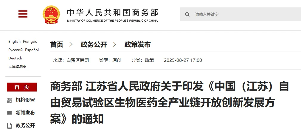 2025年8月,經(jīng)國務院同意,商務部和江蘇省人民政府聯(lián)合印發(fā)江蘇自貿區(qū)生物醫(yī)藥全產(chǎn)業(yè)鏈創(chuàng)新發(fā)展方案。江蘇成為全國第一個獲批生物醫(yī)藥領域試點的省份。針對方案,江蘇省人民政府也印發(fā)了專項實施方案,包含77項政策舉措。目前,蘇州自貿片區(qū)已推進31項政策落地見效。