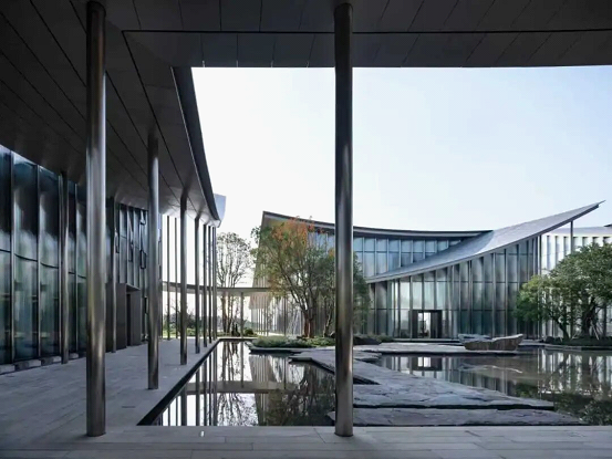Seen from above, the ribbon-like roof winds and flows, ingeniously connecting nine independent pavilions. The stainless-steel surface of the roof and the curved vertical glass facades resemble the glazed tiles of traditional Chinese architecture. As visitors stroll through the museum, they find themselves transitioning between interior and exterior spaces, with the scenery changing at every step.