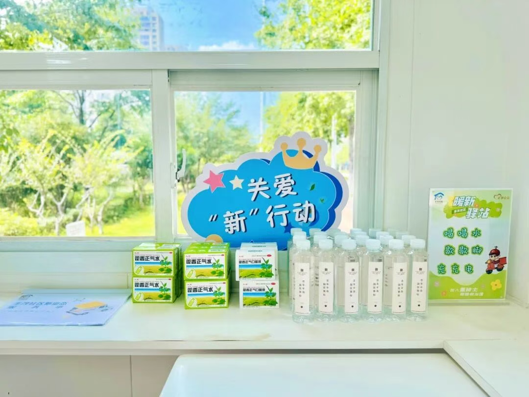 這個不大的空間,由兩座閑置亭子改造而成:空調(diào)送出徐徐涼風(fēng),充電插座的指示燈靜靜閃爍,墻上掛著共享雨傘,角落的便民箱里備有礦泉水、創(chuàng)可貼等物資。最讓騎手們滿意的是,驛站24小時開放,即便深夜下班,也能進(jìn)來喝上一口熱水。